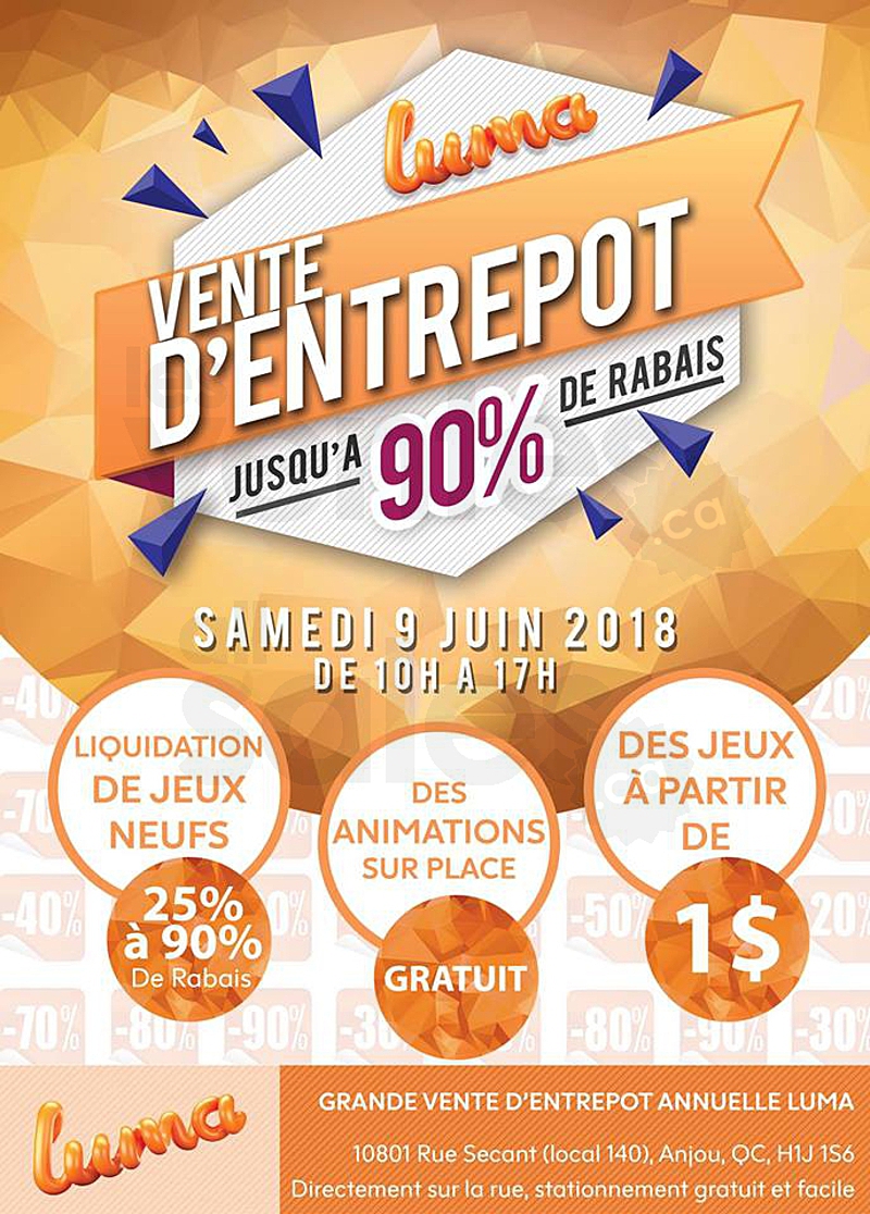 C'est la méga vente d'entrepôt de la Distribution LUMA le 9 juin à Montréal! Économisez jusqu'à 90% de rabais sur les jeux neufs. Des animations gratuites sur place ainsi que les jeux à partir de 1$.