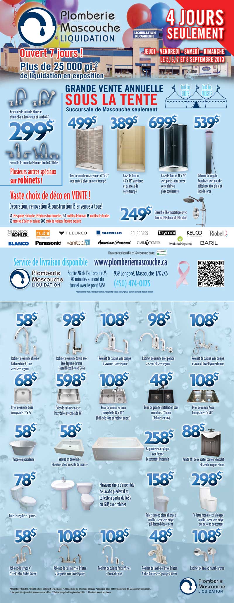 Cette année encore nous vous invitons à notre succursale de Mascouche pour notre grande vente annuelle sous la tente! 4 jours de surprises et de bas prix ! Du jeudi 5 septembre au dimanche 8 septembre 2013. Jusqu'à 70% de rabais!