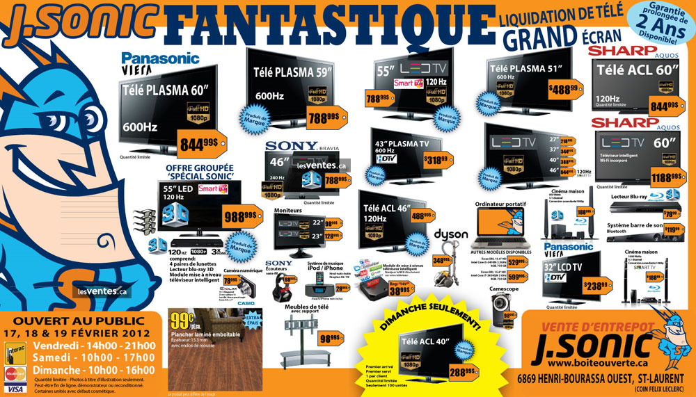 Liquidation de télé grand écran du 17 au 19 février. J. Sonic un entrepôt géant qui vous offre une gamme complète de produits divers, électroniques et téléviseurs, surplus de marchandise et appareils recyclés toujours au meilleur prix.