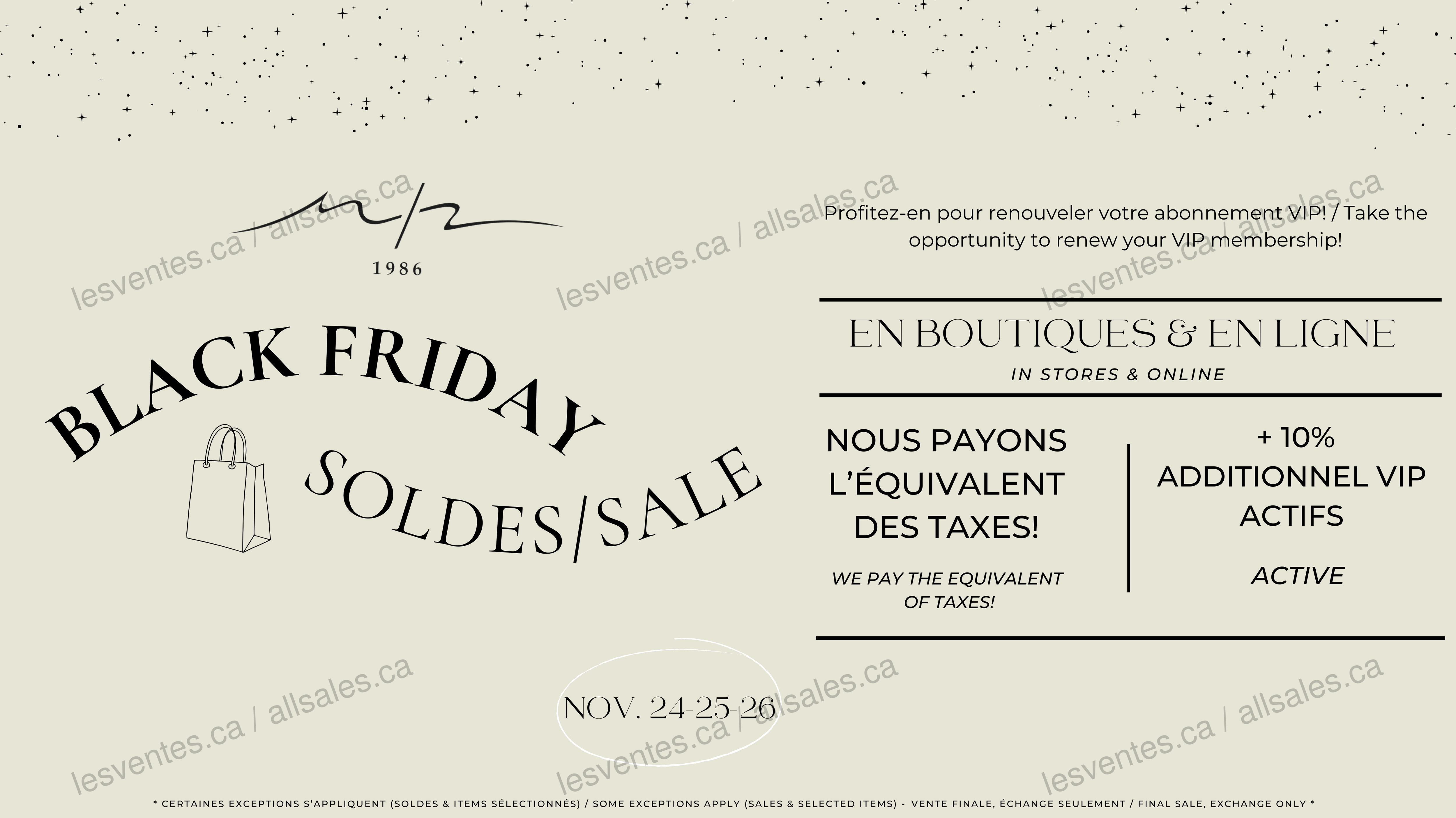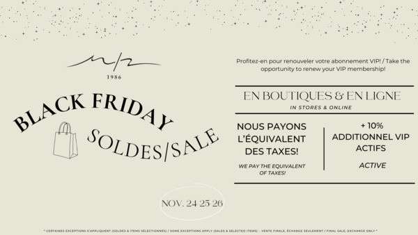 Le Vendredi Fou est de retour chez M/2 Boutiques du 24 au 26 novembre, en boutiques et en ligne! Nous payons l'équivalent des taxes + 10% additionnel pour les membres VIP actifs. Profitez-en pour renouveler votre abonnement VIP!