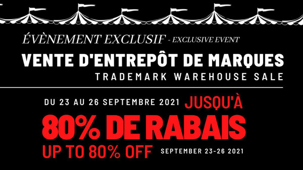 Vente d'entrepôt de marques du 23 au 26 septembre. Jusqu'à 80% de rabais sur des articles pour homme et femme. HUGO • BOSS • MATINIQUE • PART TWO • TIGER OF SWEDEN • ZEGNA • MOS MOSH • SCOTCH&SODA • LACOSTE et encore plus!