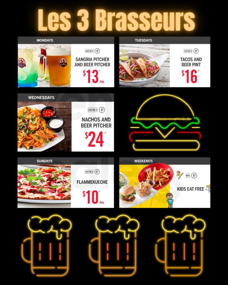 Super promotions sur la nourriture et l'alcool chez les 3 Brasseurs! Bière, nachos et plus encore!