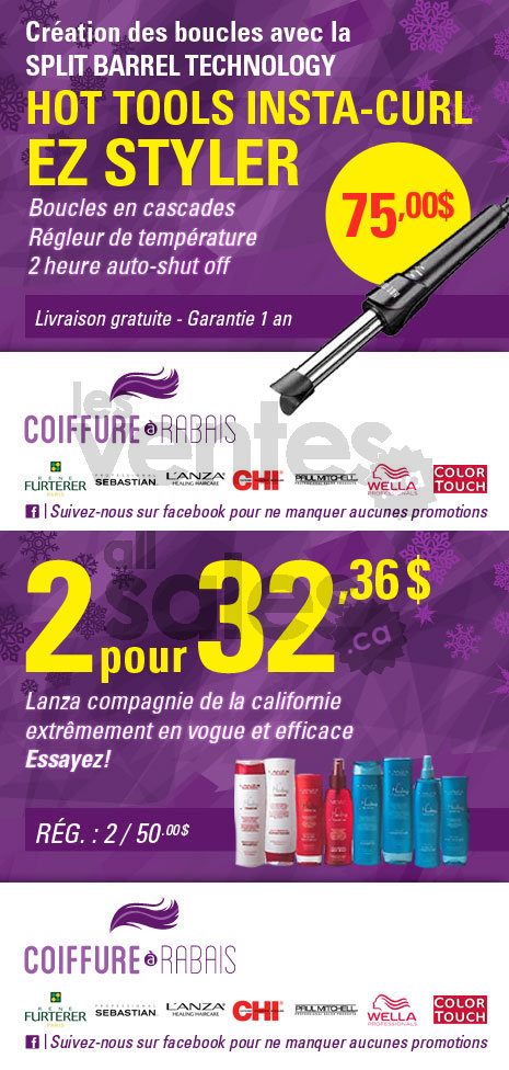 Coiffure à rabais est une boutique en ligne de produits capillaires professionnelles. Nous détenons les plus grandes marques jusqu'à 75 % de rabais. Vous trouverez des produits des grandes marques: Wella, Sebastian, Rene Furterer, CHI, Lanza, etc...