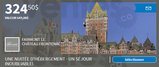 Ne payez que 324,50$ pour 1 chèque-cadeau d'une valeur de 649$ échangeable au Fairmont Le Château Frontenac contre 1 nuitée d'hébergement dans 1 chambre de catégorie Fairmont + le petit-déjeuner buffet des plus copieux au restaurant Dufferin*.
