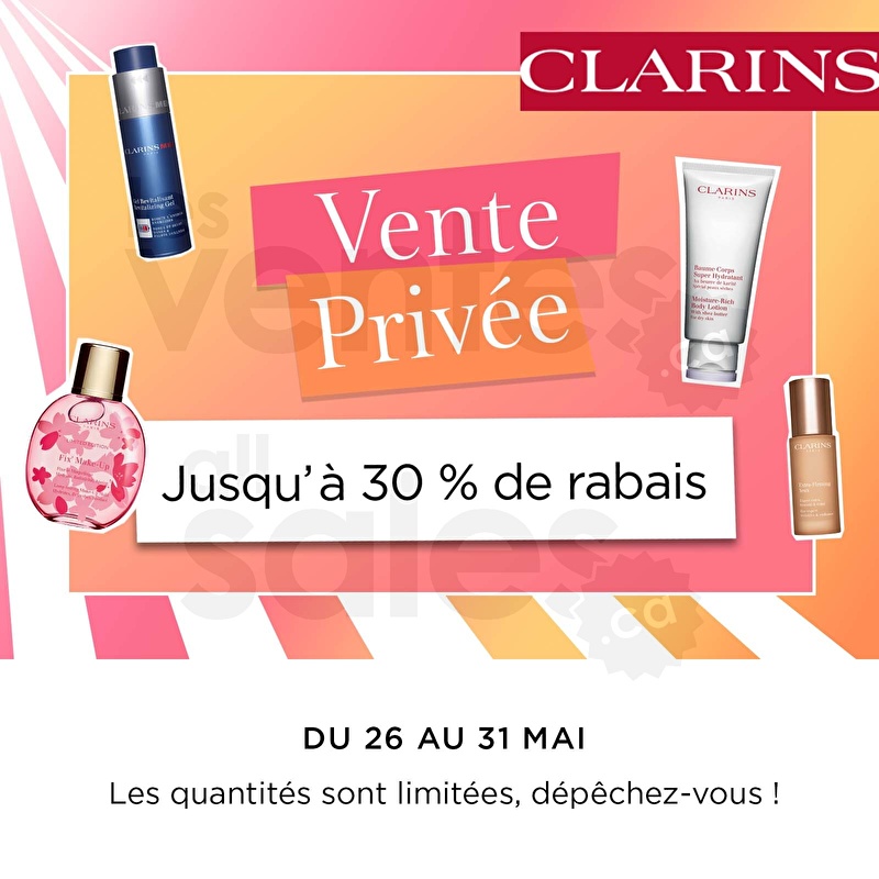 Renouvelez votre routine beauté avec une panoplie de produits Clarins parmi les plus populaires à des prix irrésistibles jusqu’à 30% de rabais. En plus, recevez la livraison offerte avec toute commande & un cadeau de 3 pièces OFFERT dès 100$ d’achat.