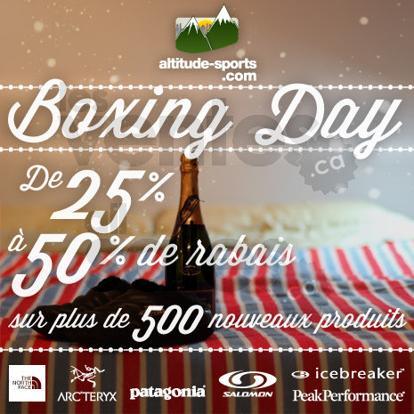 500 nouveaux produits en rabais pour le Boxing Day. Économisez de 25% à 50% sur les nouveaux modèles des marques les plus populaires; Arc'teryx, The North Face, Patagonia, Icebreaker, Salomon, Peak Performance et plusieurs autres.