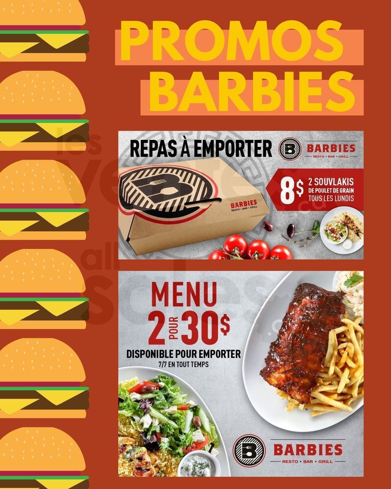 Profitez des promotions Barbies! Tous les jours profitez de notre 2 pour 30$ et ne manquez surtout pas le lundi souvlaki!