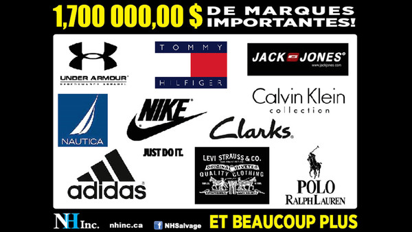 Liquidation de grandes marques chez NH Inc.! Plus de 1,7 millions de $ à liquider. Under Armour, Tommy Hilfiger, Jack & Jones, Calvin Klein, Nautica, Nike, Adidas, Levi Strauss, Clarks, Polo Ralph Lauren et plusieurs autres.
