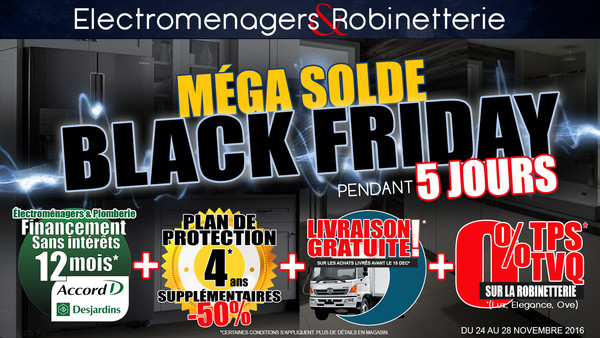 Méga solde du Vendredi Fou 5 jours seulement chez Électroménagers et Robinetterie Longueuil! Du 24 au 28 novembre, profitez de plusieurs promotions en magasin. Aussi, le vendredi 25 novembre, une sélection d'appareils sera offerte au prix coûtant!