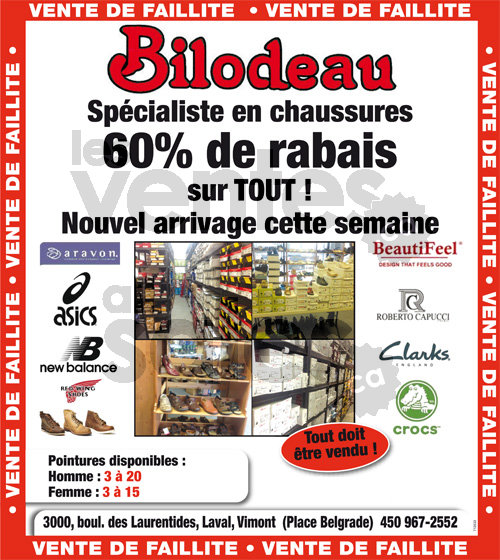 Vente de faillite Bilodeau, spécialiste en chaussures pour hommes et femmes! Tout doit être vendu. Économisez 60% sur tout! Pointures disponibles : hommes - 3 à 20, femmes - 3 à 15 : Clarks, Crocs, New Balance, Asis, Roberto Capucci, Avaron et plus.