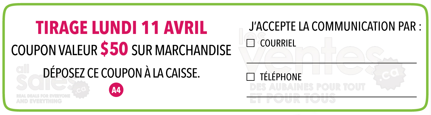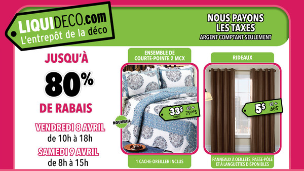Vente du manufacturier pour 2 jours seulement, les 8 et 9 avril, avec des rabais jusqu'à 80%! Ensembles de douillettes 20$ et+, oreillers standards 2 pour 13$, draps 11$ et+, rideaux 5$ et+, coussins assortis et accessoires de salle de bain 3$ et +.
