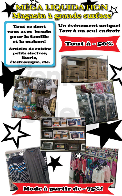 Marchandise neuve et de qualité pour toute la famille et pour la maison vendue à des prix jamais vus auparavant. Rabais de 75% sur une grande sélection de vêtements. Articles ménagers -50% : micro-ondes, literie, vaisselle, produits, meubles etc.