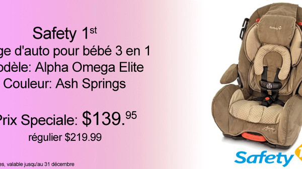 Économisez jusqu'à 80$ sur des sièges d'auto Safety 1st! Le modèle Alpha Omega Elite 3 en 1 est en solde à 139,95$ (prix rég. 219,99$) et le modèle Onboard Air est à seulement 134,95$ (prix rég. 199,99)*. Dépêchez-vous, les quantités sont limitées!