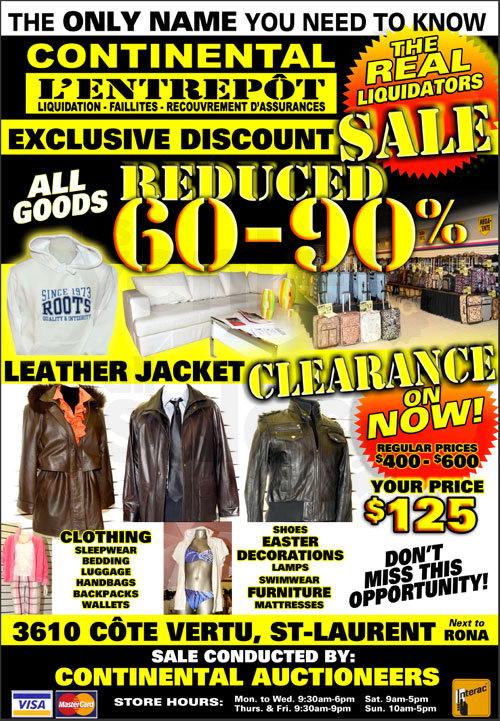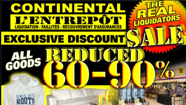 Dernière semaine! L'entrepôt Continental ferme le 2 septembre! Économisez de 60 à 90% sur les vêtements et accessoires pour toute la famille, valises, meubles, décorations, etc.