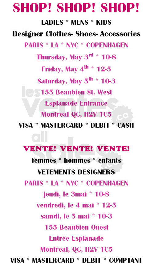 Du 3 au 5 mai vente de liquidation de la saison passée chez Simms Sigal & Co. Vêtements, accessoires et chaussures importés de Paris, LA, NY et Copenhague pour toute la famille, homme, femme et enfants.