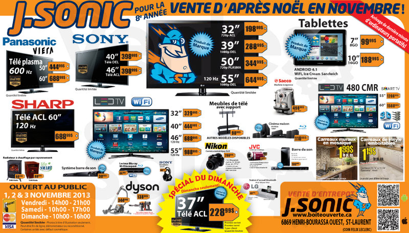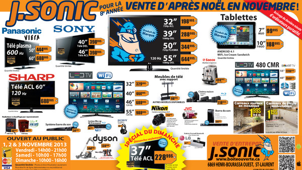 Du 1er au 3 novembre prochain, c'est la vente d'après Noël en novembre chez J.Sonic! Venez économiser sur des téléviseurs plasma, DEL et ACL, des cinémas maison, des ordinateurs portatifs, des tablettes, des appareils photo numériques et plus encore!