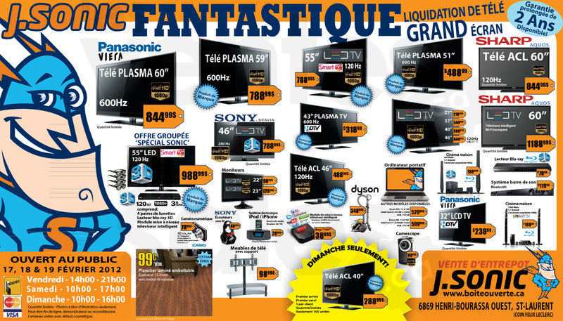 Liquidation de télé grand écran du 17 au 19 février. J. Sonic un entrepôt géant qui vous offre une gamme complète de produits divers, électroniques et téléviseurs, surplus de marchandise et appareils recyclés toujours au meilleur prix.
