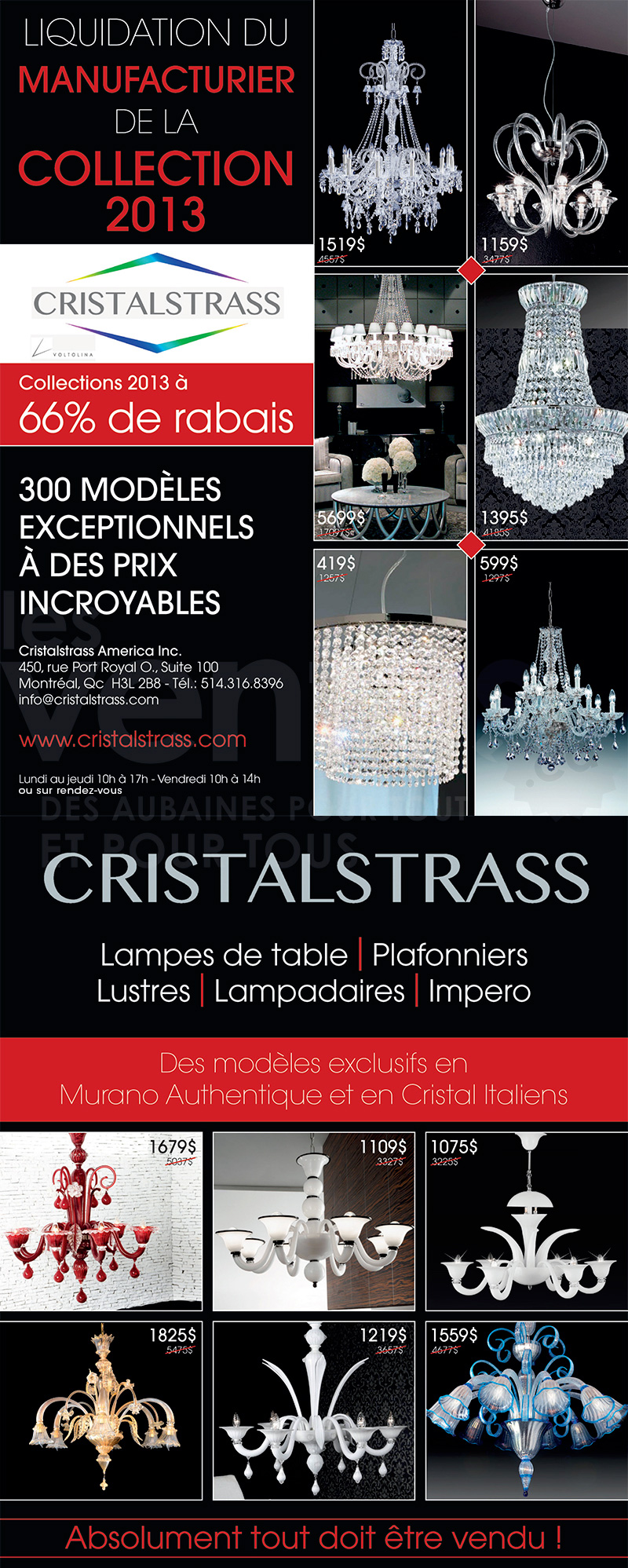 Liquidation de luminaires du manufacturier Cristalstrass, tout doit partir! Économisez 66% sur le cristal de qualité supérieure et verre de Murano. Plus de 300 modèles à prix incroyables! Lampes de table, plafonniers, lustres, lampadaires et impero.