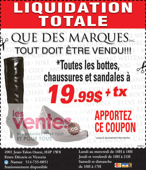 Liquidation totale chez Que Des Marques! Toutes les bottes, chaussures et sandales sont à 19,99$ + taxes sur présentation du coupon!