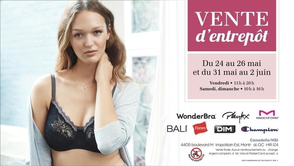 Vente d'entrepôt Wonderbra, Hanes, Bali, MaidenForm, Playtex, DIM, Champion, 24 au 26 mai et 31 mai au 2 juin! Profitez de rabais sur une vaste sélection de produits: sous-vêtements pour femmes, hommes & enfants, collants DIM et vêtements Champion.