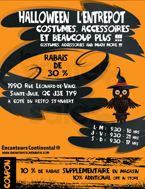 Planifiez la fête d'Halloween chez Continental à Ste-Julie! Procurez-vous des décorations extérieures ou intérieures, ainsi que votre costume et accessoires dès maintenant. Économisez 30% du prix régulier, et un 10% additionnel avec notre coupon.
