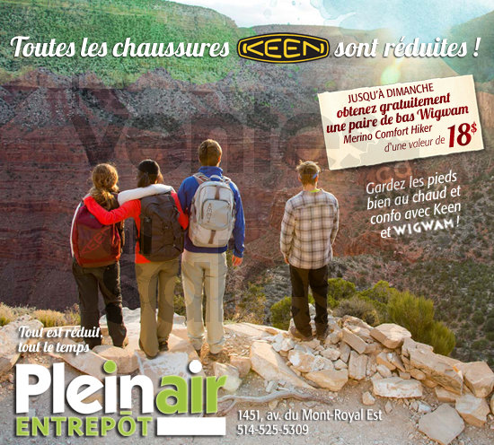 Plein Air Entrepôt vous offre toutes les chaussures Keen à prix réduit! Jusqu'à dimanche le 28 septembre, obtenez gratuitement une paire de bas Wigwam Merino Comfort Hiker (valeur de 18$). Gardez les pieds bien au chaud et confo avec Keen et Wigwam!