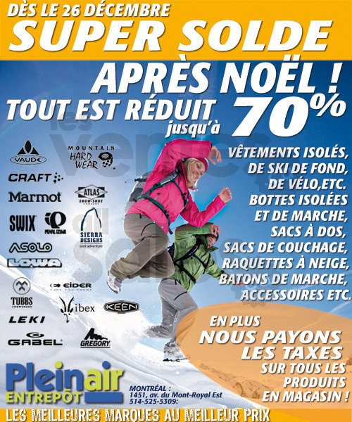 Chez Plein Air Entrepôt, le super solde d'après-Noël débute le 26 décembre. Jusqu'à 70% de rabais sur vêtements isolés de ski de fond et de vélo, bottes isolées et de marche, sacs à dos, sacs de couchage, etc. En plus, nous payons les taxes!