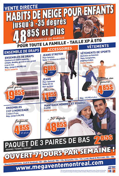 Chez Méga Vente d'Entrepôt, les ensembles de neige pour enfants (12 mois à 18 ans) et manteaux pour adultes sont à partir de 48,85$! Aussi rabais de 75%-90% sur des vêtements pour toute la famille (3 mois à 5TG), habits pour homme (34 à 60) 99.99$..