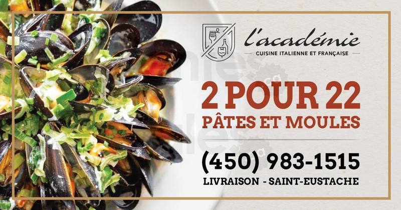 L'Académie de St-Eustache est ouvert! Profitez du spécial 2 pour 22$ pâtes et moules disponible en livraison entre 17h et 1h.