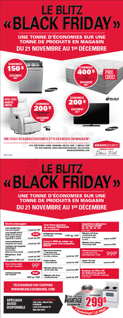 Du 21 novembre au 1er décembre, c'est le blitz Vendredi Noir chez Ameublement Denis Riel. Une tonne d'économies sur une foule de produits en magasin : matelas, électroménagers, téléviseurs... Spéciaux aussi disponible chez Club Meubles Avantage.