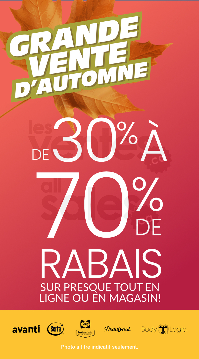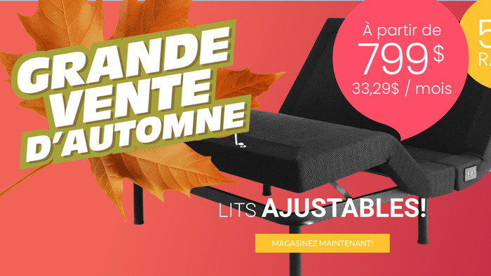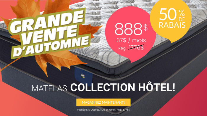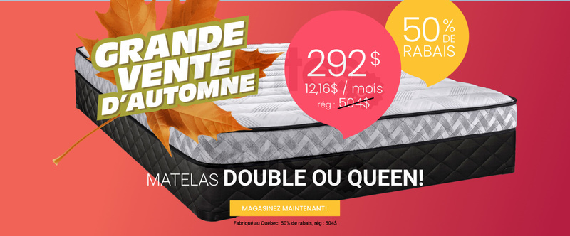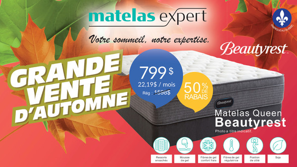 Grande vente d'automne chez Matelas Expert! Rabais de 30% à 70% sur presque tout en magasin. Visitez l'un de nos 4 magasins pour profiter des meilleurs prix sur des matelas et bases de lit de première qualité!