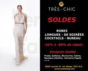 Offrez-vous des vêtements de vos designers préférés sans les prix élevés chez Très Chic! Choisissez parmi notre sélection de robes longues, de soirée, cocktail et pour le bureau en solde de 25% à 80% de rabais. Adrianna Papell, Prada, Galliano...