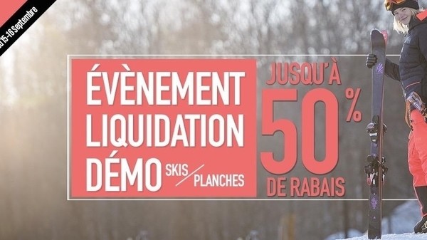 C'est la grande vente de skis et planches démonstrateurs dans nos deux magasins le 22 -23 septembre! Jusqu'à 50% de rabais sur plus de 75 modèles: Salomon, Atomic, Blizzard, Nordica et Elan. C'est le moment de vous équiper pour l'hiver à petits prix!
