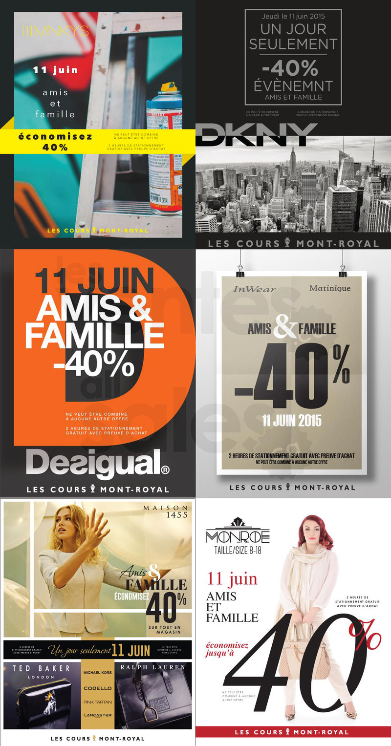 Le 11 juin, venez faire un tour aux Cours Mont-Royal! IIIMNKYS, DKNY, Desigual, InWear & Matinique, Maison 1455 et Boutique Monroe font un événement Amis et Famille. Jusqu'à 40% de rabais sur les marques haut de gamme les plus prisées.