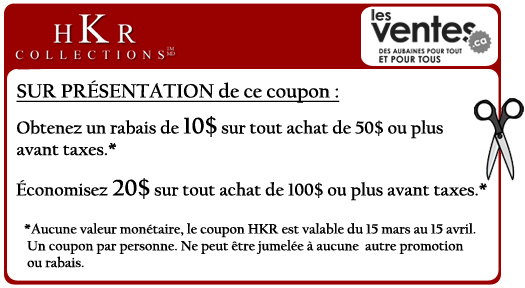 HKR Collections est toujours resté fidèle au style qui a fait son succès en se renouvelant sans cesse. Profitez de l’offre HKR exclusive sur lesventes.ca applicable dans tous nos magasins du 15 mars au 15 avril. Imprimez votre coupon rabais de 20$.