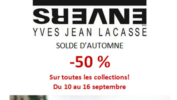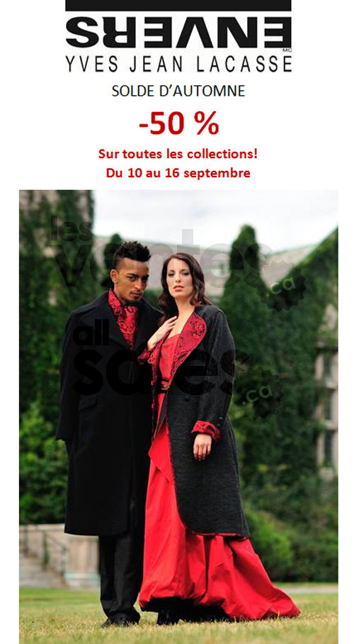 Solde d’automne, du 10 au 16 septembre 50% de rabais sur toutes les collections homme et femme à la Maison de couture ENVERS par Yves Jean Lacasse. Une occasion exceptionnelle! Offrez-vous une tenue exclusive de grand couturier à prix réduit!