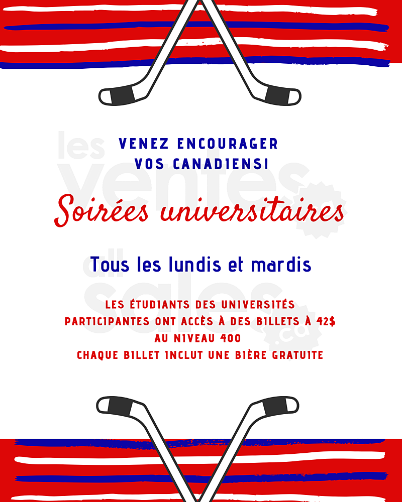 Les Canadiens de Montréal offrent aux étudiants des universités participantes la possibilité d'acheter des billets à 42$ au niveau 400 pour toutes les parties du lundi et du mardi soir au Centre Bell.