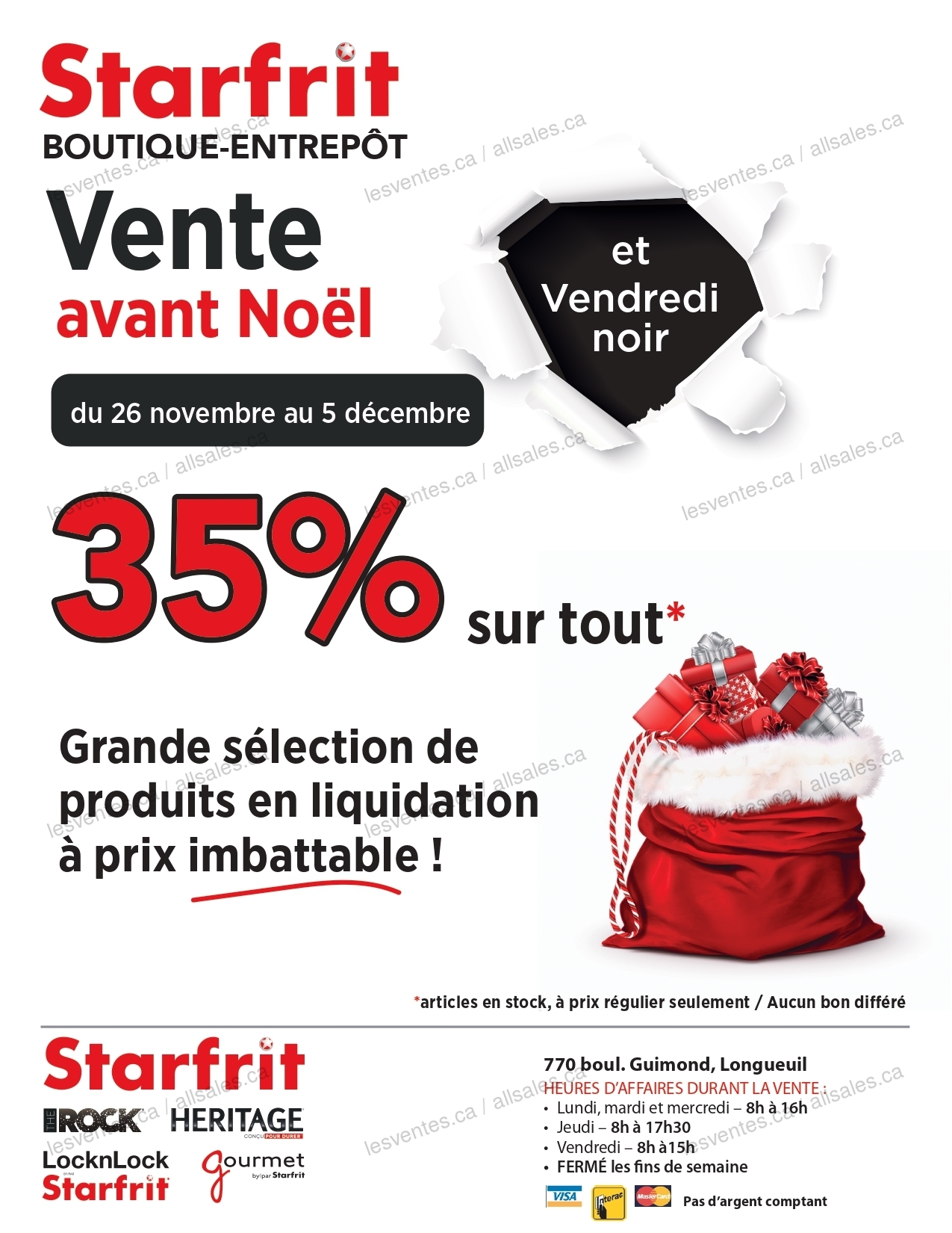 Du 26 novembre au 5 décembre, passez à la boutique-entrepôt Starfrit pour notre vente d’avant-Noël! Profitez de 35% de rabais sur tous les articles en stock à prix régulier. Économies parfaites pour préparer les Fêtes! 🎄