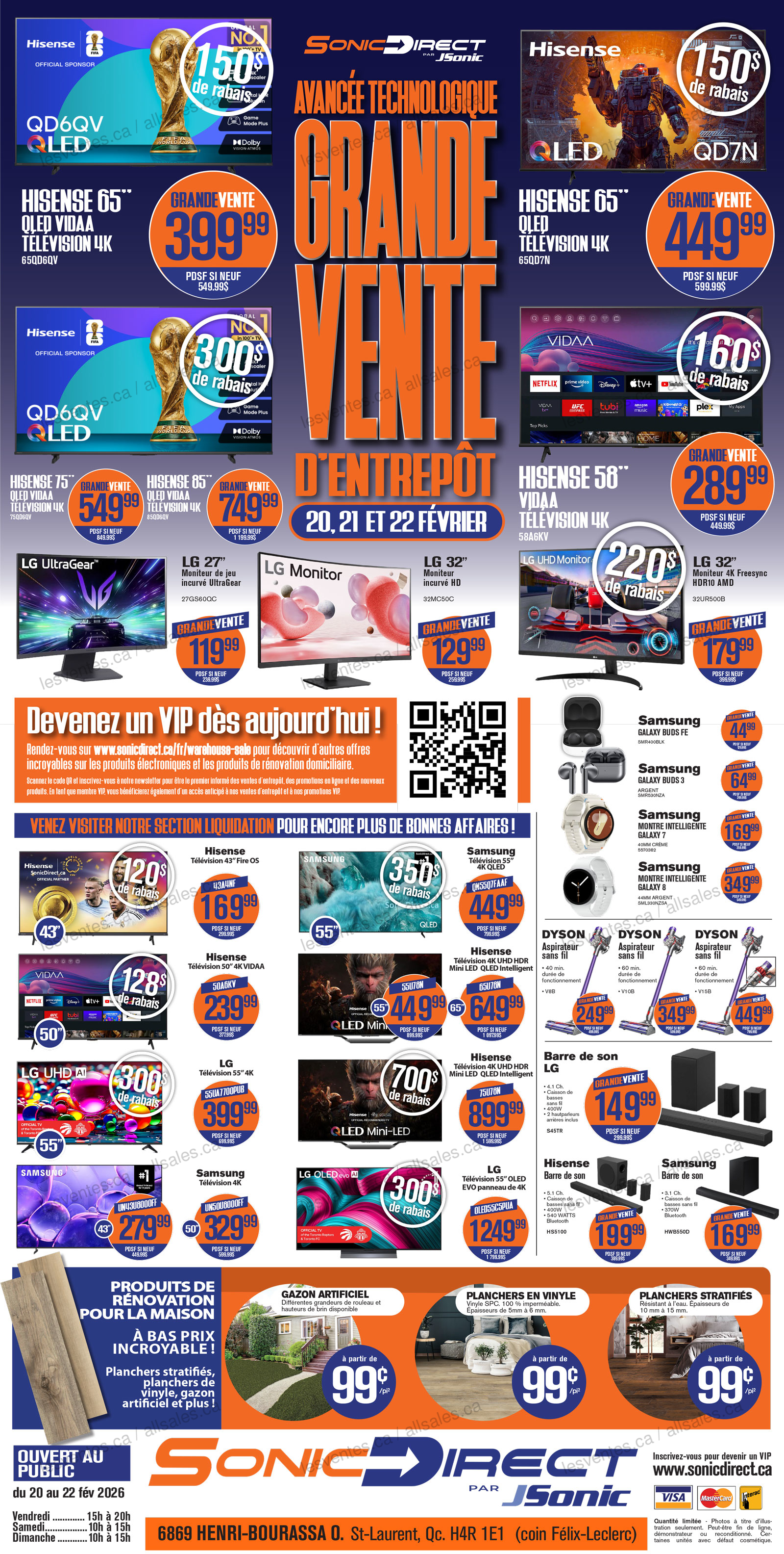 Vente d'entrepôt Sonic Direct (J. Sonic) les 20-21-22 février 2026! Télévisions intelligentes, montres, téléphones, tablettes et écouteurs, hauts-parleur, réfrigérateurs et beaucoup plus.