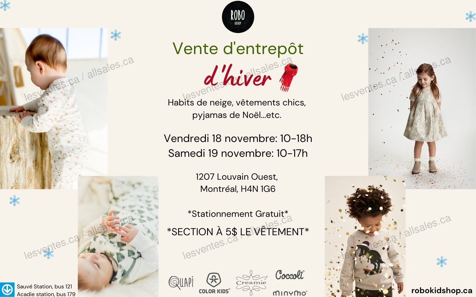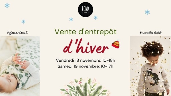 Vente d'entrepôt d'hiver de vêtements pour enfants les 18 et 19 novembre. Habits de neige, vêtements chics, pyjamas de Noël, etc. Venez économiser sur des marques telles Coccoli, Color Kids, Minymo, Quapi, Creamie et plus! Section à 5$ le vêtement.