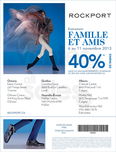 Du 6 au 11 novembre obtenez un rabais de 40% dans les magasins de détail Rockport. Rockport.ca participera également à la vente amis et famille en vous offrant un rabais de 30 % sur la marchandise en ligne.
