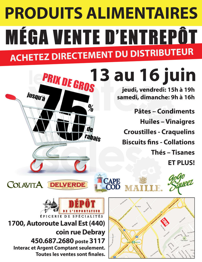 Du 13 au 16 juin profitez de rabais jusqu’à 75% sur des produits alimentaires de spécialités en achetant chez le distributeur! Nous avons des surplus à liquider au prix de gros sur des marques connues de pâtes, croustilles, condiments, huiles, etc.