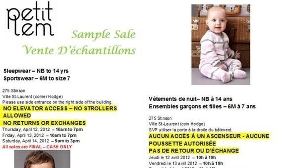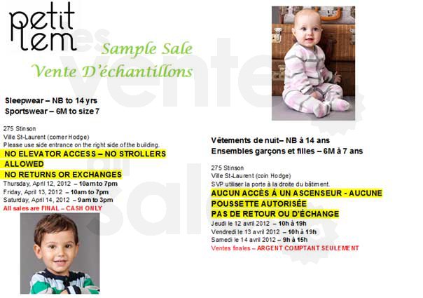 Du 12 au 14 avril, vente d'échantillons Petit Lem, pyjamas pour enfants tailles 0 à 14 ans, ensembles et vêtements pour filles et garçons tailles 6 mois à 7 ans. Petit Lem où le confort de vos enfants est notre priorité.