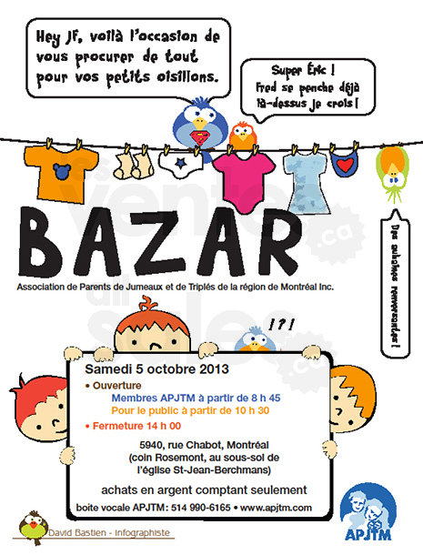 Le seul Bazar où l'on trouve de tout pour les enfants! Vêtements, jouets, meubles, poussettes simples, doubles, triples et plus encore! L'Association de Parents de jumeaux et triplets de Montréal vous invite à son Bazar samedi le 5 octobre.