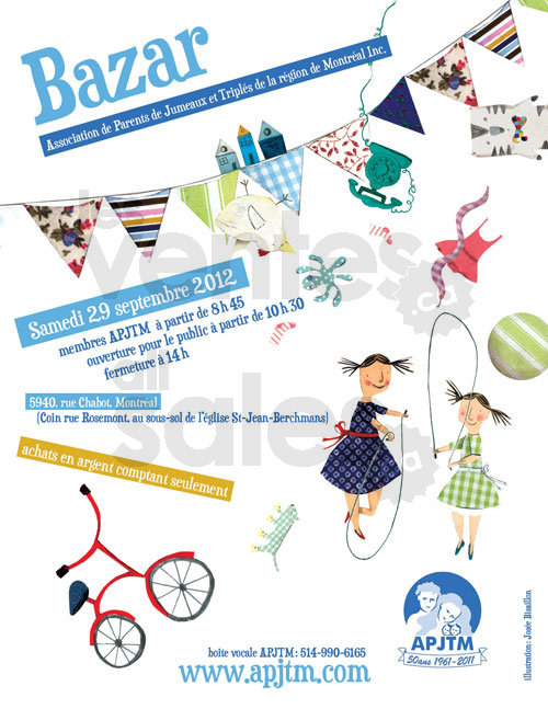 Le seul Bazar où l'on trouve de tout pour les enfants! Vêtements, jouets, meubles, poussettes simples, doubles, triples et plus encore! L'Association de Parents de jumeaux et triplets de Montréal vous invite à son Bazar samedi le 29 septembre.