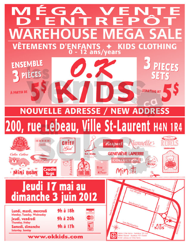 La Méga vente d'entrepôt OK Kids, c'est du 17 mai au 3 juin! Des économies de 50% et plus sur tous les vêtements pour enfant de 0 à 12 ans : Gusti, Geneviève Lapierre, Minoti, Petit Lem, Mini Bean, Calin Caline, Nannette, Baby Rebels et beaucoup plus.