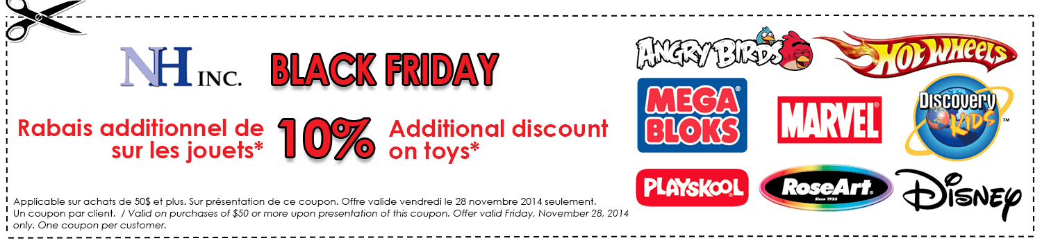 Imprimez le coupon et apportez-le au magasin pour recevoir un rabais additionnel de 10% sur les achats de jouets de 50$ et plus. Valide vendredi le 28 novembre 2014 seulement.