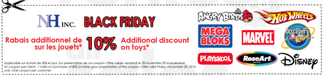 Faites vos achats de cadeaux de Noël pour enfants chez NH Inc durant la vente du Vendredi Noir! Les plus belles marques de jouets pour tous les âges!Tout à -50 % du prix de détail et -10% suppl. avec le coupon joint. Disney, Playskool, Marvel ...