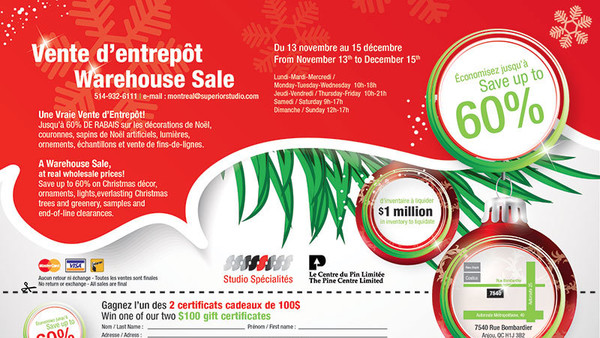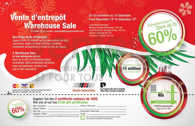 Voici une grande vente d’entrepôt qui arrive juste à temps pour le temps des Fêtes! Économisez jusqu’à 60% sur des décorations de Noël, couronnes, sapins de Noël artificiels, lumières, ornements, échantillons et vente de fin de ligne.