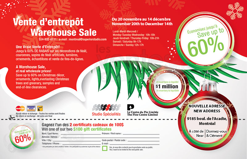 Voici une grande vente d’entrepôt qui arrive juste à temps pour le temps des Fêtes! Économisez jusqu’à 60% sur des décorations de Noël, couronnes, sapins de Noël artificiels, lumières, ornements, échantillons et vente de fin de ligne.